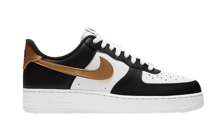 The Air Force 1 ’07 ‘Black Gold’ showcases gilded accents on an otherwise neutral design. The low-top makes use of a white leather upper with contrasting black overlays at the forefoot and heel.