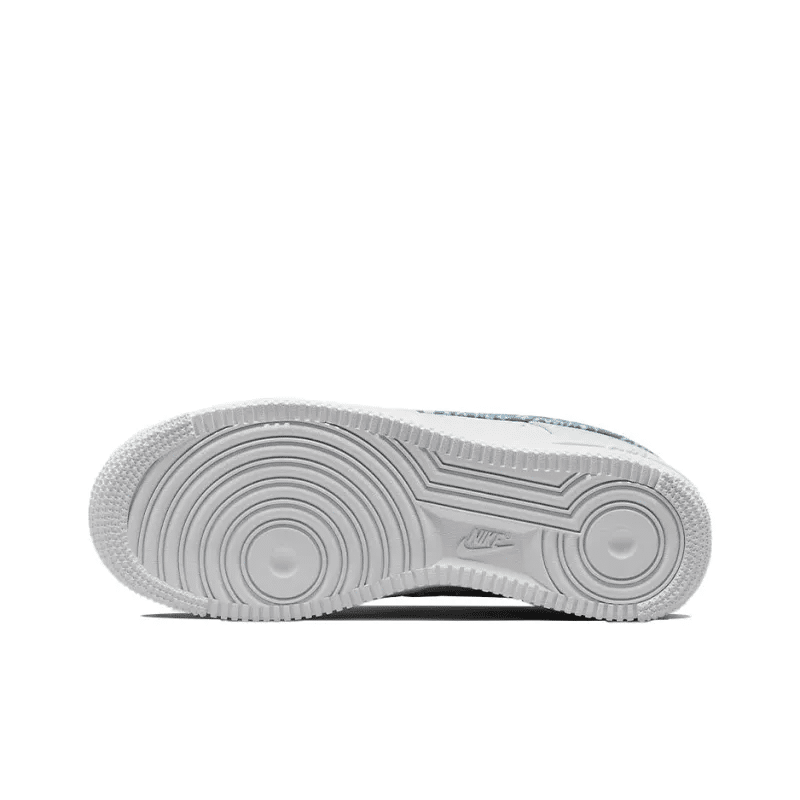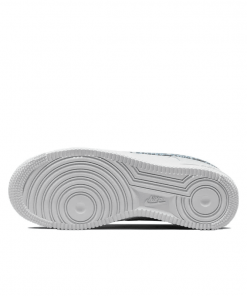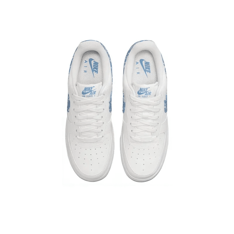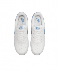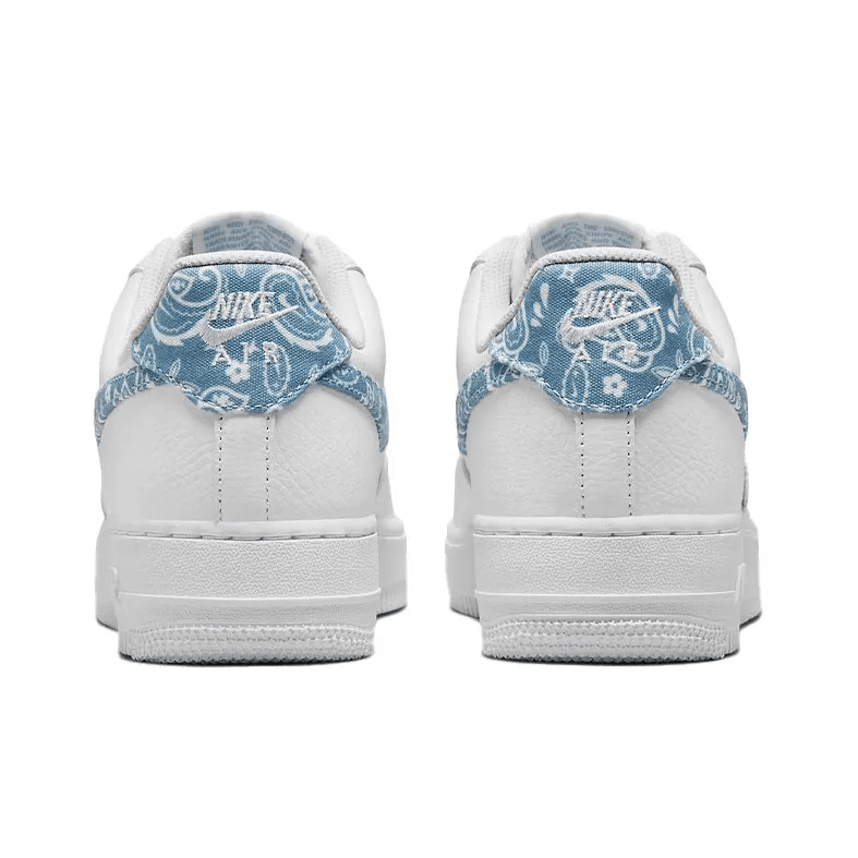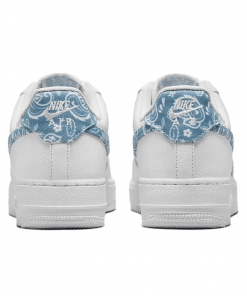 The womens Air Force 1 07 Essentials Blue Paisley gives the retro hoops shoe a new look, highlighted by textile detailing on the signature Swoosh and back tab.