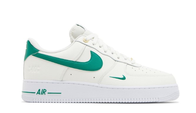 The Air Force 1 ’07 LV8 ’40th Anniversary – Sail Malachite’ celebrates four decades of the iconic sneaker with a refined design and luxurious details. The upper is crafted from premium sail leather, accented by malachite green details on the Swoosh and heel tab. This elegant color combination adds a touch of sophistication to the classic silhouette. Unique anniversary branding and gold accents commemorate the milestone, making this edition a collector’s item. Traditional Air cushioning ensures superior comfort and support, while the rubber outsole provides reliable traction. Perfect for those who appreciate history and style, the Sail Malachite edition is a standout choice for any sneaker collection.