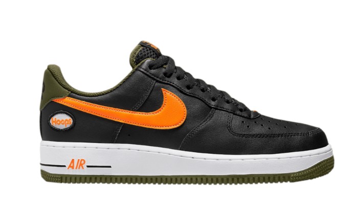 The Air Force 1 ’07 LV8 ‘Hoops’ celebrates the shoe’s original incarnation as a performance basketball model. The upper is crafted from black leather with a contrasting Total Orange Swoosh and an embroidered ‘Hoops’ patch on the lateral heel.