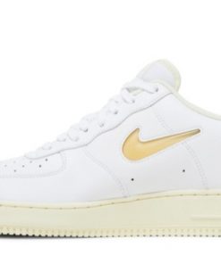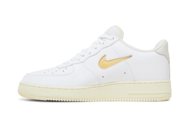 The Air Force 1 ’07 LX ‘Pale Vanilla’ brings a pared-down aesthetic to the legacy silhouette. Stripped of the traditional heel overlay, the refashioned white leather upper is accented with a yellow jeweled Swoosh and a cracked leather heel tab marked with embroidered Air branding.