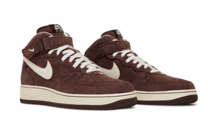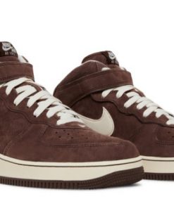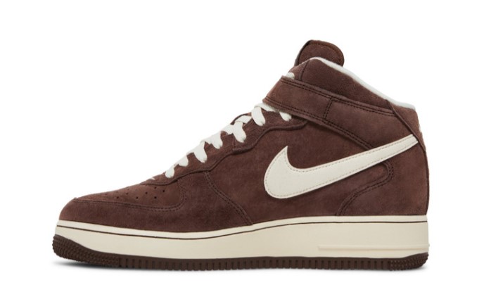 The Air Force 1 Mid ‘Chocolate’ pairs iconic basketball style with a premium build. The upper utilizes velvety suede in a chocolate brown hue, contrasted by subtle cream accents on the signature Swoosh, laces, and collar lining.