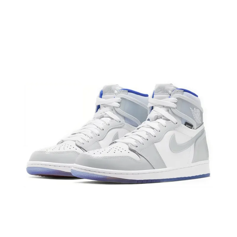 The Air Jordan 1 High Zoom Racer Blue updates the iconic silhouette with full-length Zoom Air cushioning and transparent detailing. The latter takes the form of clear overlays on the sneaker’s heel panel and collar flaps, embellished with a Jordan Wings logo on the lateral side.