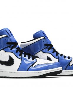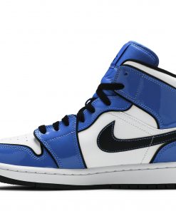 The Air Jordan 1 Mid SE ‘Signal Blue’ treats the classic silhouette to a design refresh. The sneaker’s white leather upper is fortified with shiny patent leather overlays, outlined in black and filled in with vibrant blue coloring.