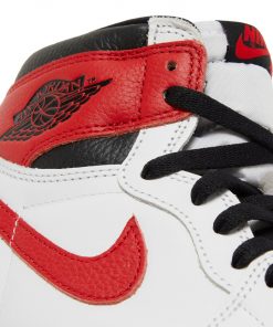 The Air Jordan 1 Retro High OG ‘Heritage’ showcases a familiar color scheme rooted in the history of the Jordan franchise. The white leather upper features contrasting hits of University Red on the toe box, Swoosh, heel, and ankle flap. The latter is stamped with a retro Wings logo in black, matching the laces and high-cut padded collar.