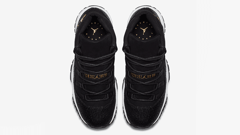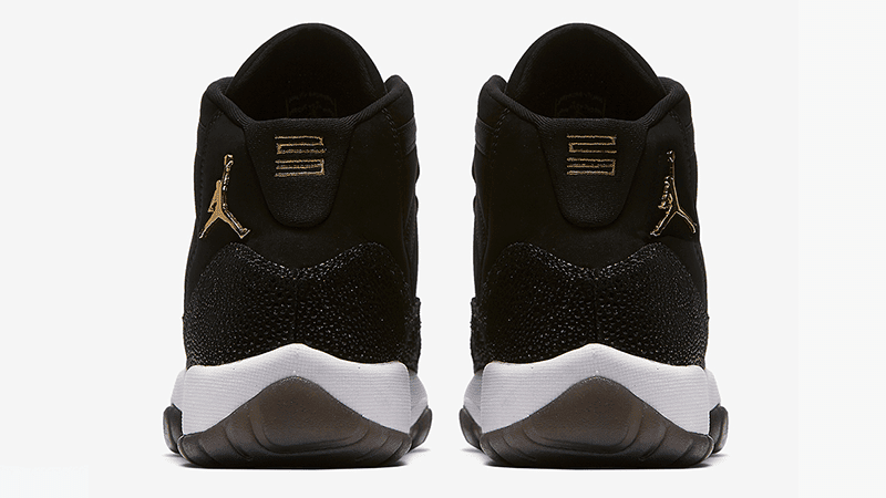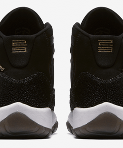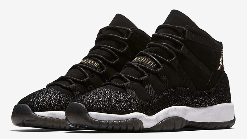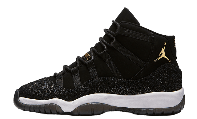 Released in November 2017, the Air Jordan 11 Retro Premium GS Heiress updates the silhouette with this girls exclusive. This premium kids model includes a black suede upper and shimmering metallic accents, giving the shoe a luxe look. A leather mudguard has a glitter effect which adds some shine to every step.
