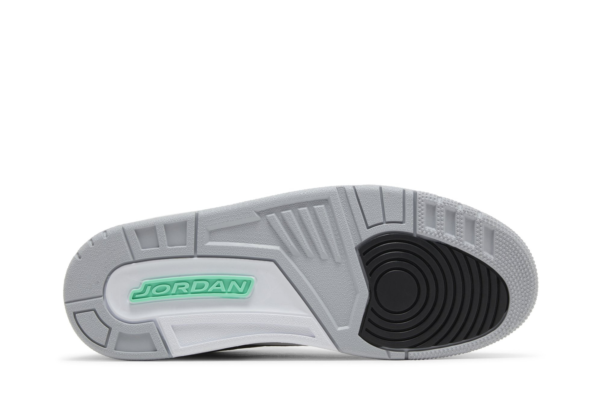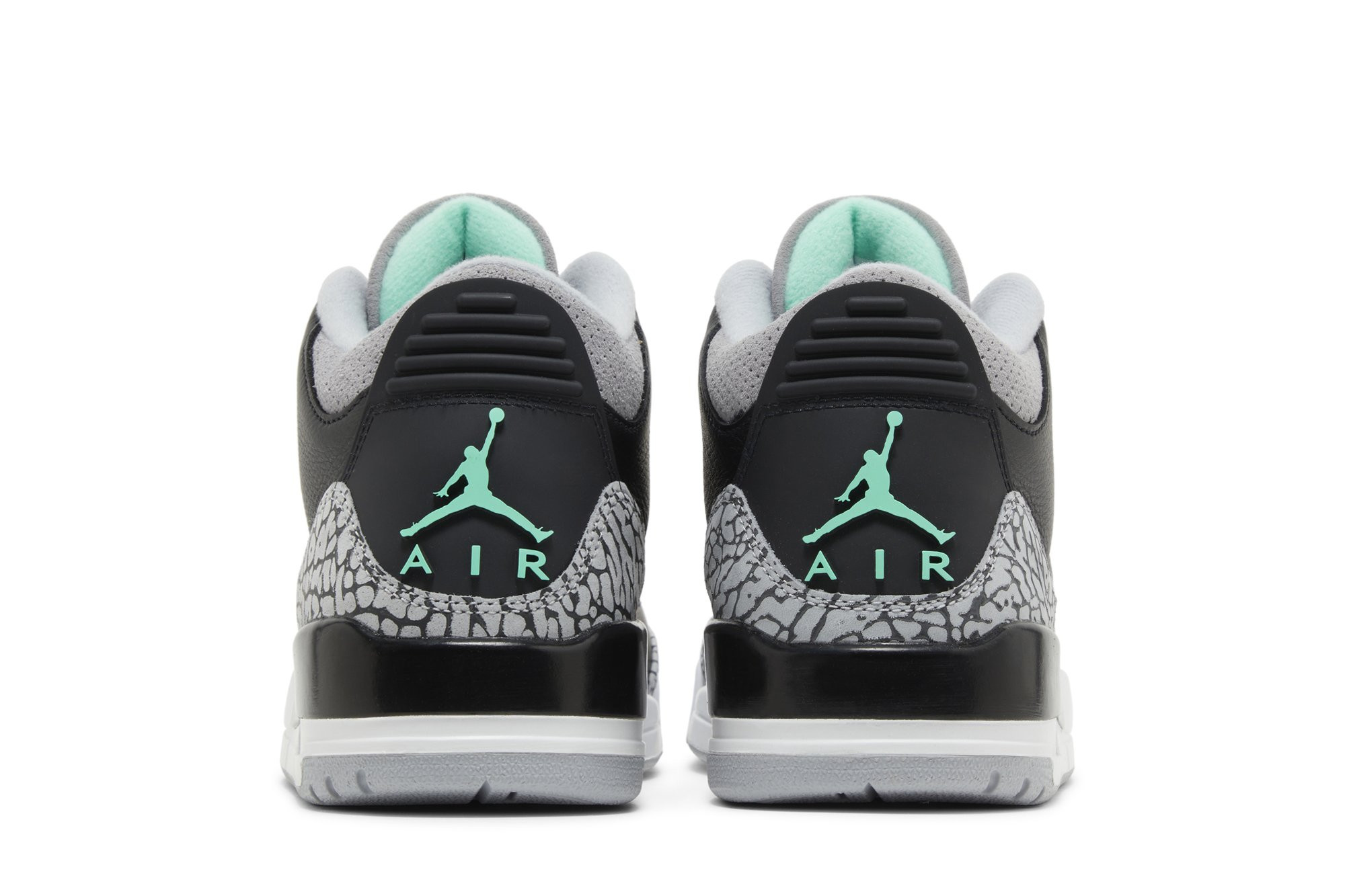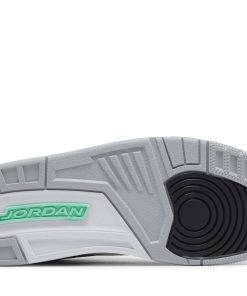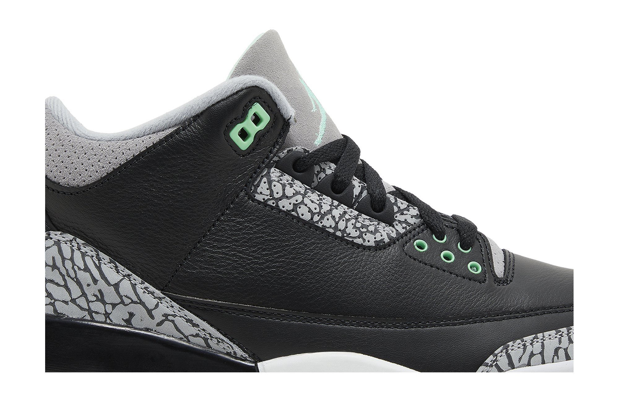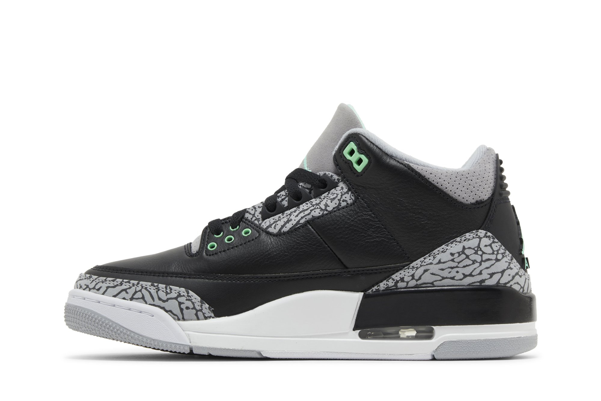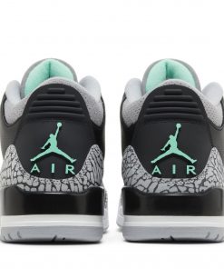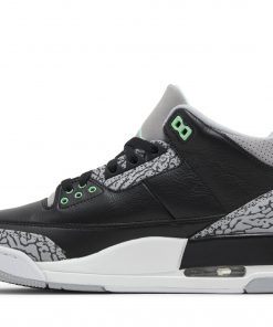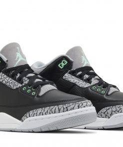 The Air Jordan 3 Retro ‘Green Glow’ adds brilliant flashes of color to a neutral design that calls to mind the OG ‘Black Cement’ colorway. The upper features tumbled black leather with grey elephant print detailing on the eyestay, toe cap and heel overlay.