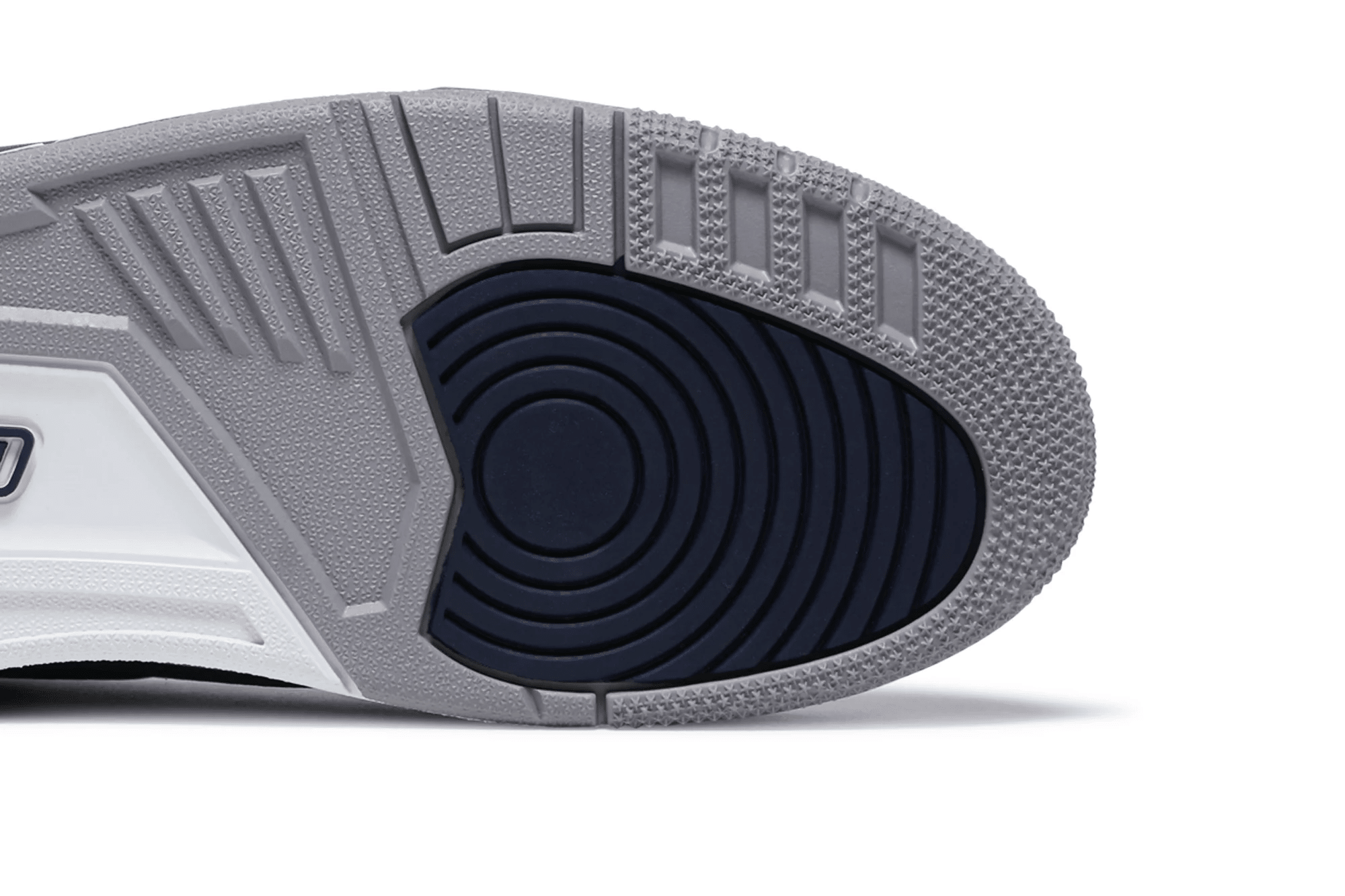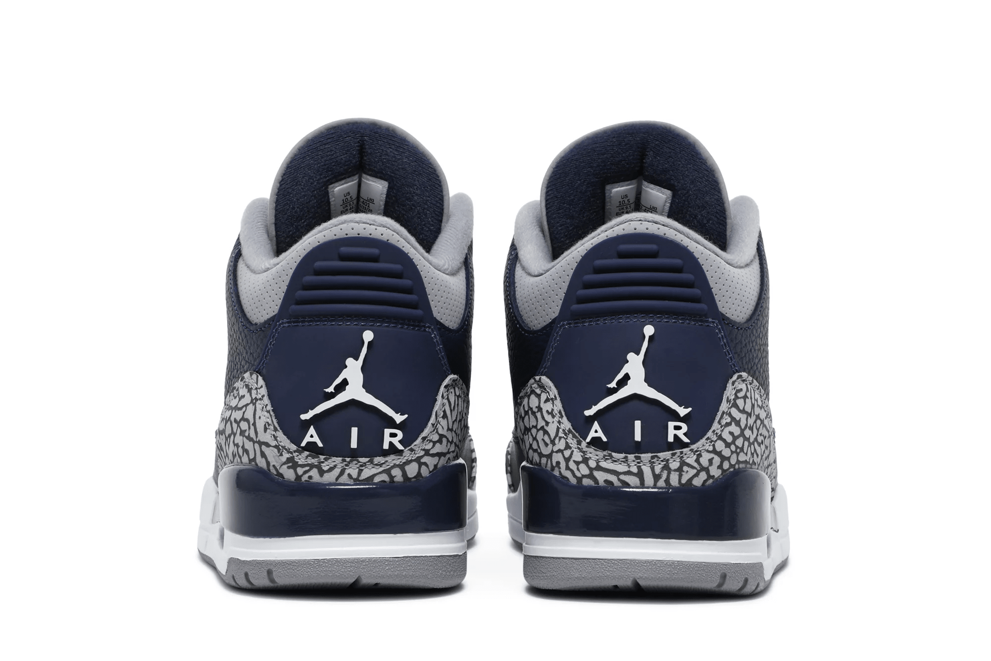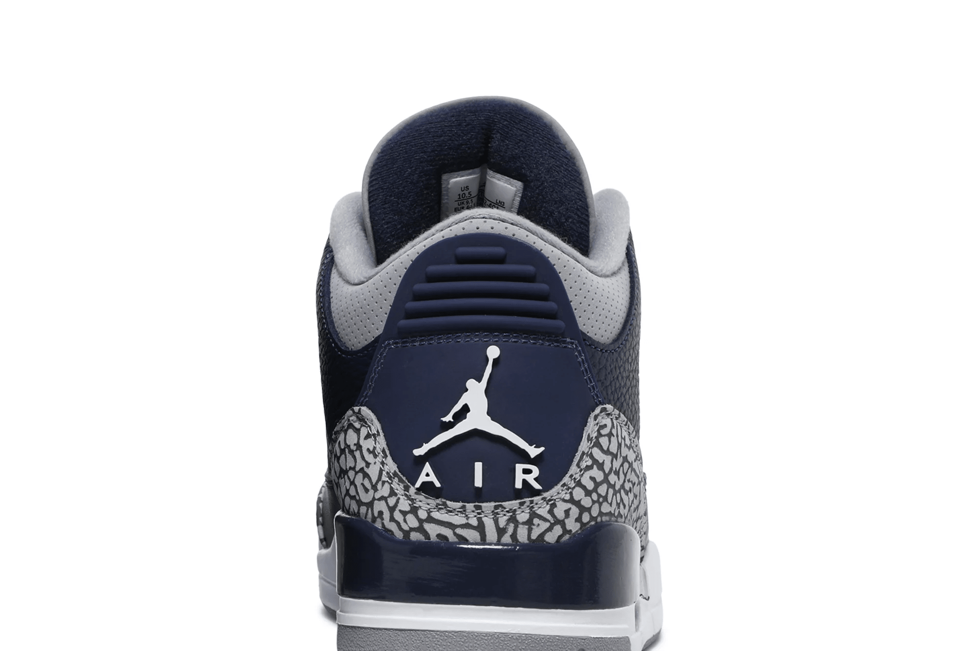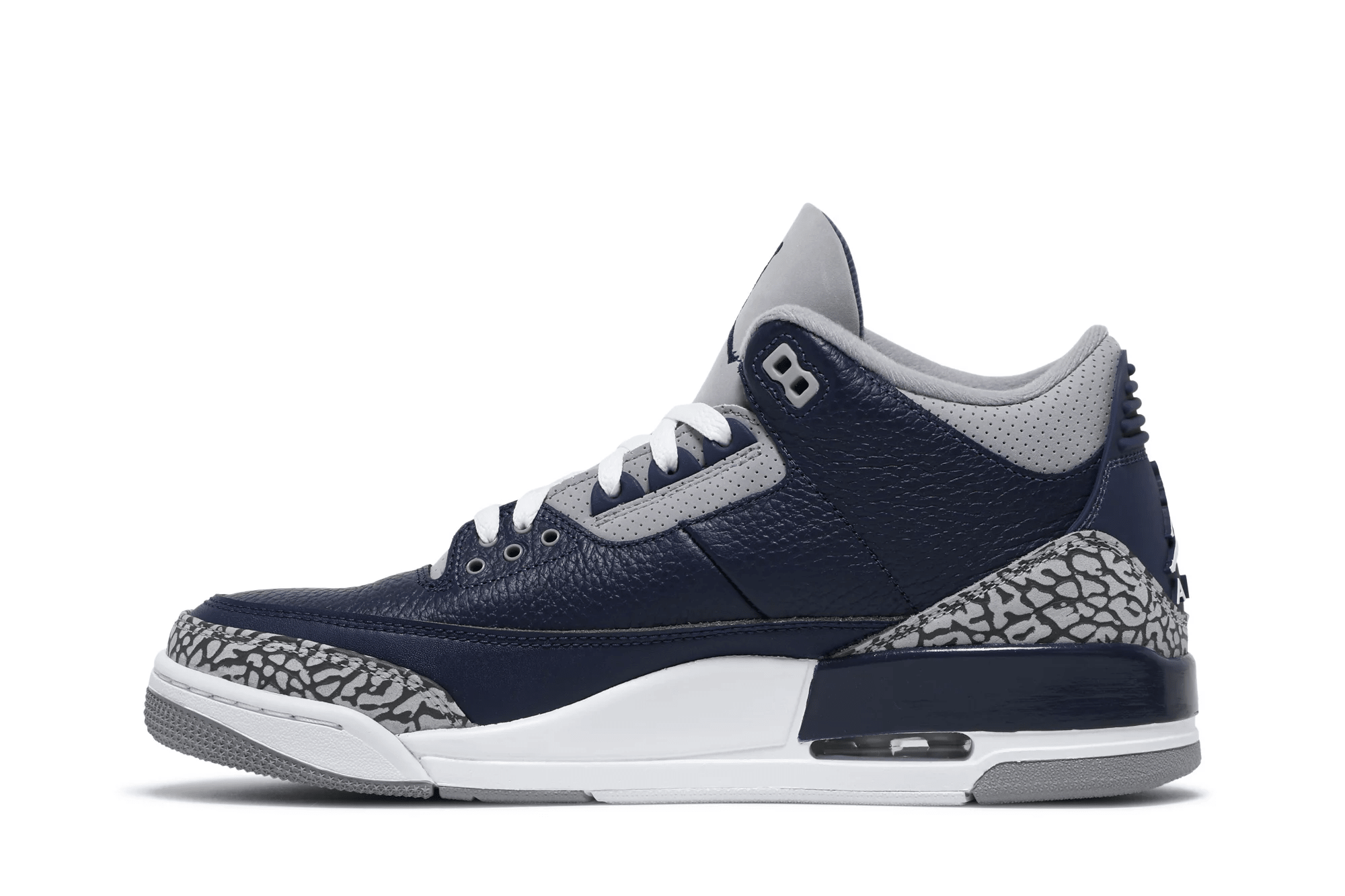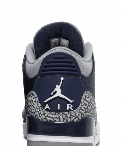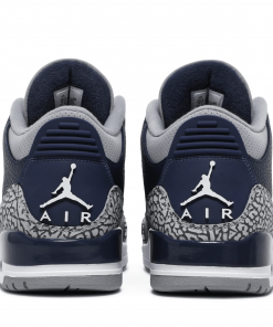 The Air Jordan 3 Retro ?Georgetown? is clad in the signature colors of the Hoyas, the team that Michael Jordan victimized on the way to an NCAA national championship. The classic silhouette features a navy tumbled leather upper, reinforced with signature elephant print overlays at the toe and heel.
