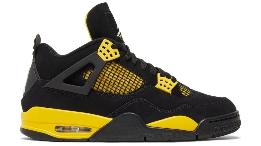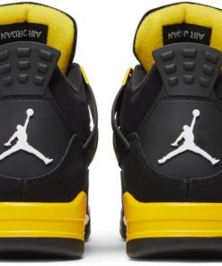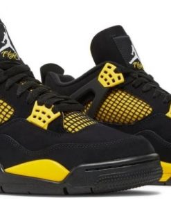 The Air Jordan 4 ‘Thunder’ brings back the electrifying colorway that has been a favorite among sneaker enthusiasts since its debut. The sneaker features a black nubuck upper that exudes a sleek and luxurious vibe. The standout feature is the vibrant yellow accents that appear on the midsole, eyelets, and inner lining, giving the shoe a striking contrast and a bold aesthetic. These elements embody the ‘Thunder’ theme, evoking energy and power with every step. The Jumpman logos are rendered in yellow, ensuring the branding stands out against the dark backdrop. The Air cushioning in the midsole offers superior comfort and support, perfect for both athletic activities and casual wear. The durable rubber outsole provides excellent grip on various surfaces, making this sneaker both functional and stylish. The ‘Thunder’ colorway is ideal for those who love a bold and dynamic look, bringing a storm of style to any sneaker collection.