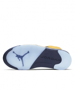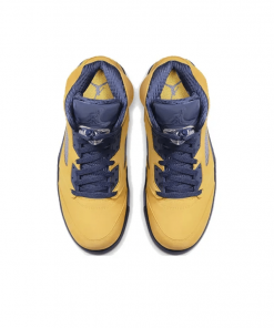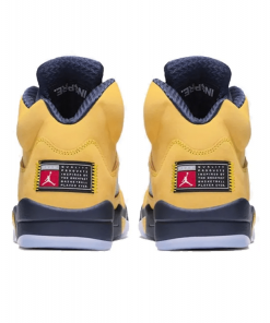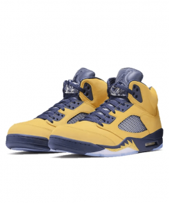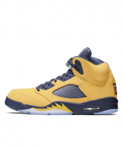 Released in August 2019, the Air Jordan 5 Retro Michigan sneaker pays homage to the legendary Michigan Wolverines through official team colors. Its Amarillo nubuck upper is tooled with TPU mesh midfoot inserts, toggled lacing and a forward-facing, embroidered Jumpman.