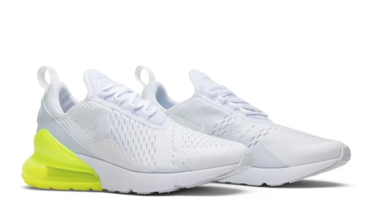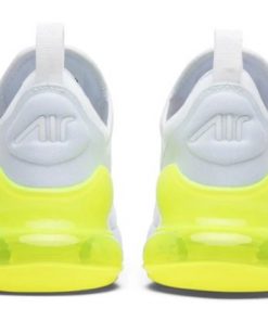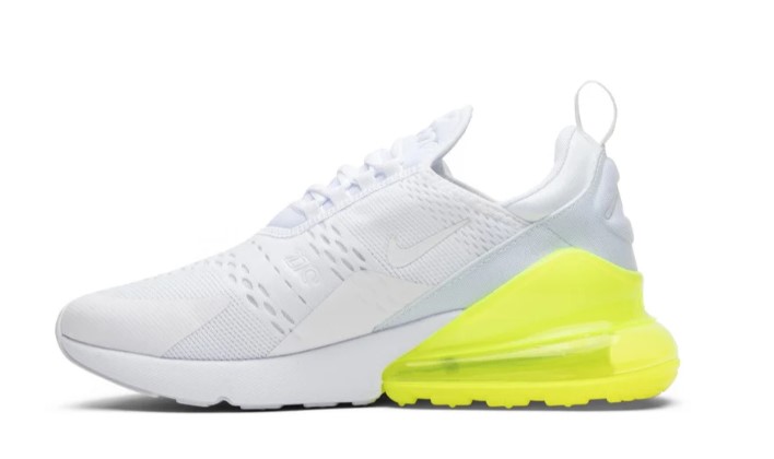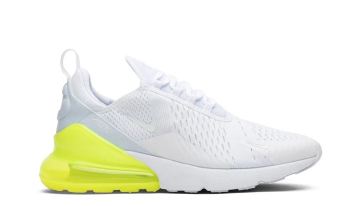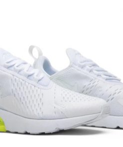 The Air Max 270 ‘White Volt’ offers a fresh and vibrant design with its unique colorway and contemporary silhouette. The upper features a white mesh construction with volt yellow accents on the Swoosh and heel, creating a striking and energetic look. The large Max Air unit in the heel provides exceptional cushioning and support, making it ideal for all-day wear. The lightweight foam midsole enhances flexibility, while the rubber outsole ensures reliable traction. Perfect for those who want to add a splash of color to their footwear collection, the ‘White Volt’ is both stylish and comfortable for everyday wear.