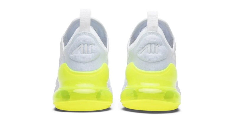 The Air Max 270 takes design inspiration from both the Air Max 180 and Air Max 93. Featuring an all-white mesh upper, the ‘White Volt’ colorway offers contrasting textures with tonal panels along the midfoot and toe complete with Swoosh branding.