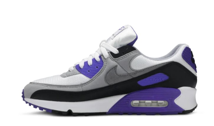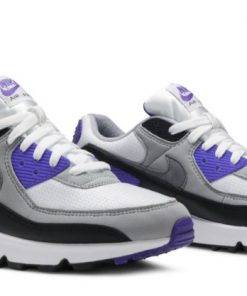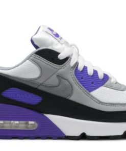 The Air Max 90 ‘Hyper Grape’ offers a bold and vibrant take on the classic silhouette. This sneaker features a mix of mesh, leather, and synthetic materials in a white and grey base, accented with striking hyper grape purple details on the Swoosh, heel, and midsole. The design is completed with black elements that add depth and contrast, making it stand out. Equipped with Air Max cushioning for superior comfort and support, the ‘Hyper Grape’ ensures a smooth ride for all-day wear, while the waffle-patterned rubber outsole provides excellent traction and durability.