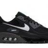 The midsole, in clean white, houses the signature Air Max cushioning, providing the comfort and support that the Air Max 90 is known for. The waffle-patterned rubber outsole, in matching navy, ensures excellent traction and durability, making these sneakers suitable for both casual and formal wear. The design is further enhanced by subtle gold accents on the eyelets and branding, adding a touch of luxury to the overall look.