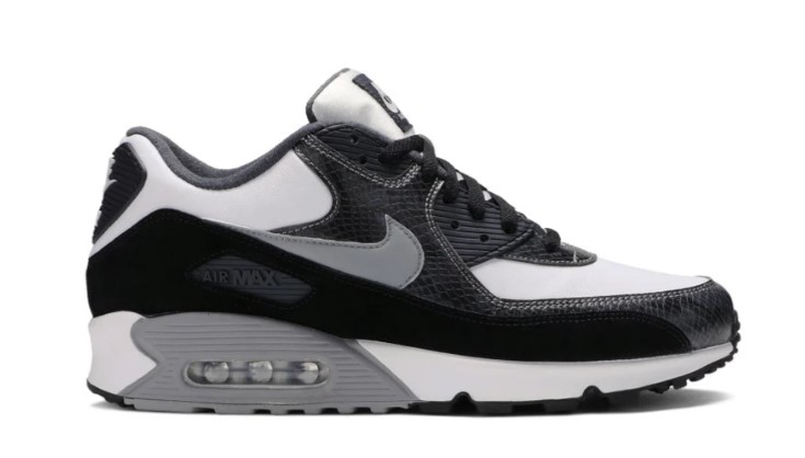 As part of the 2002 ‘Python Pack,’ brings back the Air Max 90 in June 2019 true to original form. This AM90 is outfitted with a white leather base enhanced by reptilian overlays at the toe and midfoot and black nubuck overlays along the mudguard.