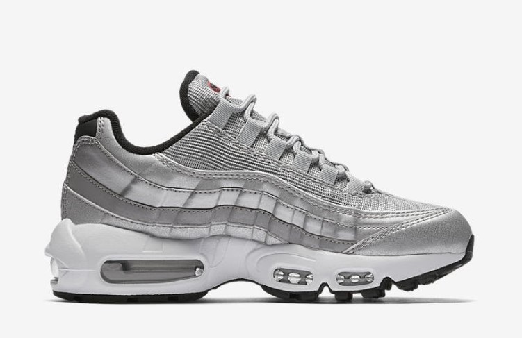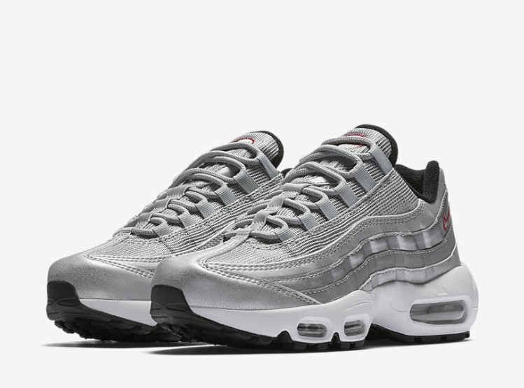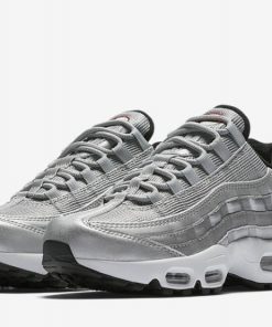 The Air Max 95 QS Silver Bullet takes inspiration from the iconic Air Max 97 ‘Silver Bullet’ colorway, combining metallic silver hues with the classic Air Max 95 silhouette. The upper is crafted from a mix of leather, mesh, and reflective materials, creating a sleek and futuristic look. The metallic silver panels are complemented by red accents and reflective detailing, enhancing visibility in low-light conditions. Equipped with Air Max cushioning for superior comfort and support, this sneaker is perfect for those who want to make a statement. The rubber outsole ensures reliable traction and durability, making the ‘Silver Bullet’ a standout addition to any sneaker collection.