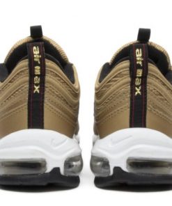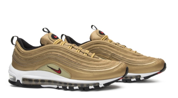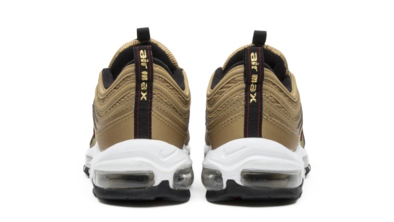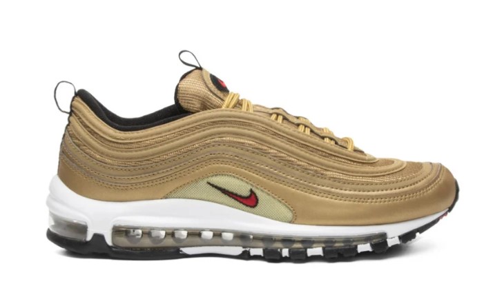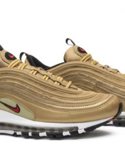 The Air Max 97 OG QS Metallic Gold is an original colorway that comes in a metallic gold upper, red swoosh accents, and a black inner lining. Released in April of 2017, the sneaker also includes a black heel tab, a full-length Total Max unit, and a black outsole.