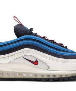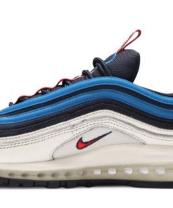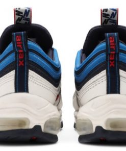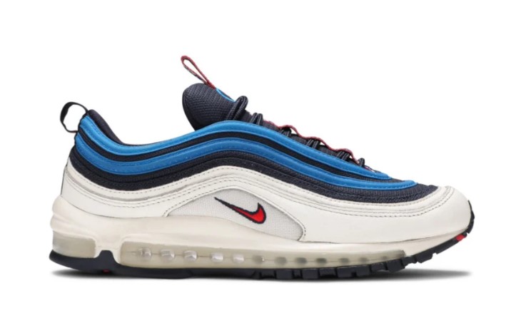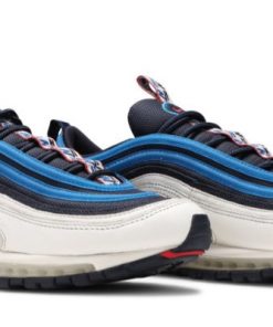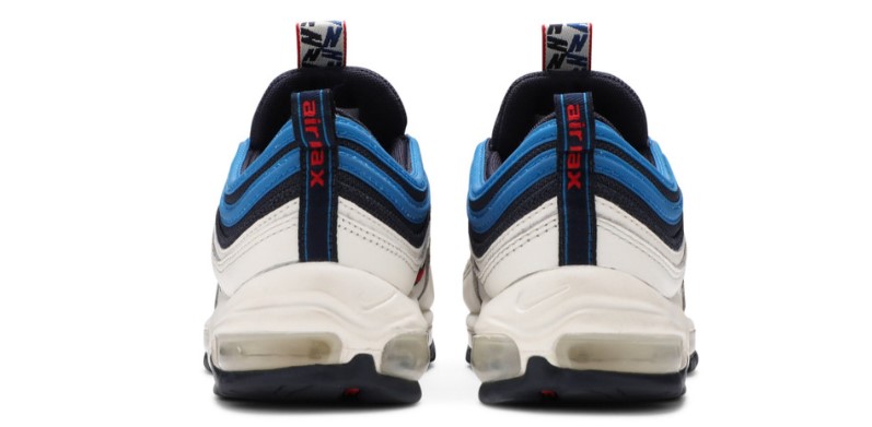 Released in 2018 as part of a Air Max collection that featured unique pull tabs, the Air Max 97 SE Blue Nebula stands out in a white upper with the sneakers signature waves in Obsidian and blue, topped by the white, red and blue pull tab covered in graphic Ns.