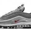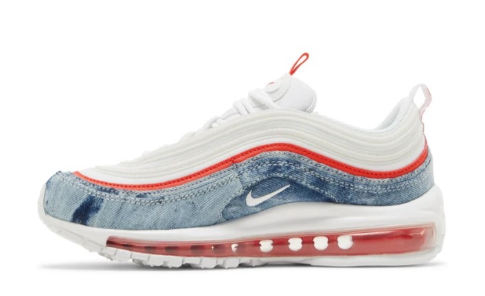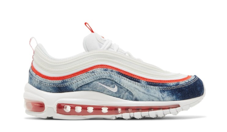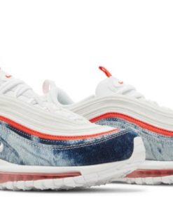 The Womens Air Max 97 Washed Denim updates the retro runner with materials and colors steeped in Americana. The white textile upper is ringed with tonal synthetic leather overlays in a 3M reflective finish.