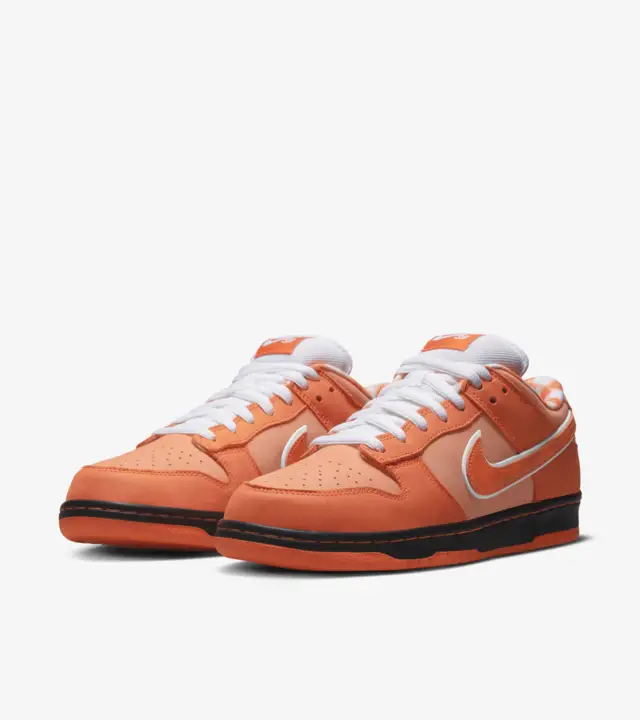 The SB Dunk Low Concepts Orange Lobster is a collaboration between Nike SB and the Boston-based retailer Concepts, drawing inspiration from the unique color variations of lobsters found in New England. The Orange Lobster is one of the most striking colorways in the series, featuring a vibrant orange upper that mimics the shell of the rare orange lobster. The upper is constructed from a combination of premium leather and suede, offering both durability and a rich texture contrast. The sneaker also features signature details such as the plaid inner lining and the elastic bands across the toe box, which are reminiscent of the bands used on lobster claws. Inside, the shoe is lined with soft, breathable fabric that ensures comfort during extended wear. The cushioned midsole provides excellent support and shock absorption, making it ideal for both skateboarding and casual wear. The rubber outsole features a grippy tread pattern that offers reliable traction on various surfaces. Whether you’re a fan of the SB Dunk series, a collector of rare sneakers, or simply someone who appreciates unique, themed designs, the SB Dunk Low Concepts Orange Lobster is a must-have addition to your collection.