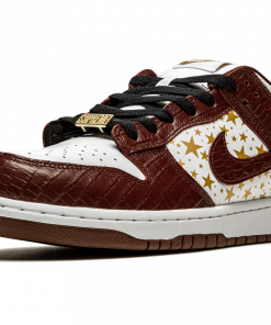 The SB Dunk Low ‘Supreme – Stars – Barkroot Brown’ is a striking sneaker that features a rich brown colorway with star-patterned detailing. Collaborating with Supreme, this sneaker boasts a premium leather upper with unique branding elements and contrasting accents. The design is completed with a classic white midsole and rubber outsole for comfort and durability. Inside, the SB Dunk Low ‘Supreme – Stars – Barkroot Brown’ is lined with soft fabric for all-day wearability. This sneaker is ideal for those who appreciate stylish collaborations and high-quality craftsmanship.